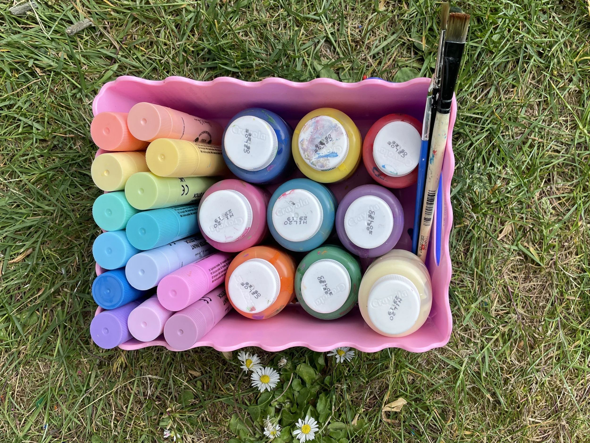 Of course kids can create art with anything, but investing in some fun, developmentally appropriate materials is going to make things so much easier. Personally, I absolutely love paint sticks for this age group. They are so richly pigmented and they just slide onto the paper so easily. Imagine drawing with a lipstick, that’s the kind of texture they have. They are nice and chunky to hold and you don’t need to apply any pressure when you use them, so they’re really easy to use for little ones. They also dry to a waterproof and smudge proof finish, so they’re brilliant for craft projects as well as art projects. We use them for everything from drawing to decorating plant pots and painting stones. Also, they are a lot less messy than poster paint. We’ve got a nice selection now, and we bought them from Tiger, The Works and Aldi.